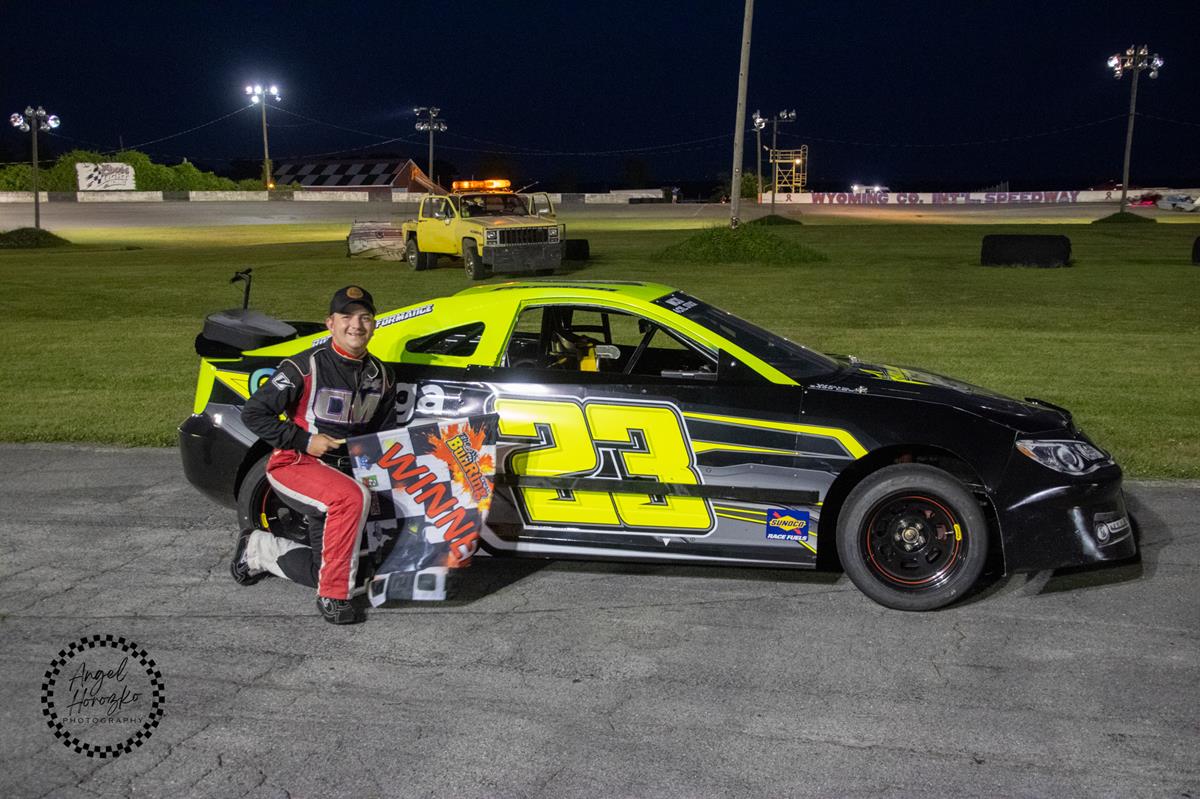 It was all about G-DOG on Saturday night, and the Pro 4s did not disappoint. Dave Heimes put on another great event filled with lap position bonuses, cotton candy and giveaways for kids. With 20 entries and a packed field of fan-favorites, Tommy Hughes of Akron, NY blasted from 7th to 1st to score the coveted Dash 4 Cash victory. Hughes gained six positions en route to victory, holding off hard chargers Eric Black (Springville, NY) and Russ Bulger Jr. (Buffalo, NY), who rounded out the podium in thrilling fashion. Lucas Parrish (East Aurora, NY) being the only 4-cyl stock joined the G-dogs and scored another victory lane spot.